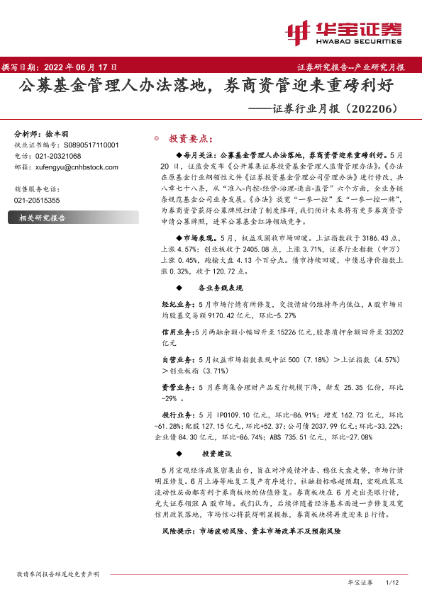 【华宝证券】【202206】证券行业月报:公募基金管理人办法落地,券商资管迎来重磅利好-12页
