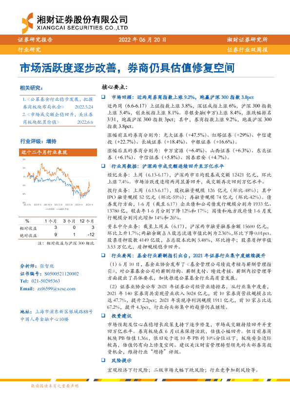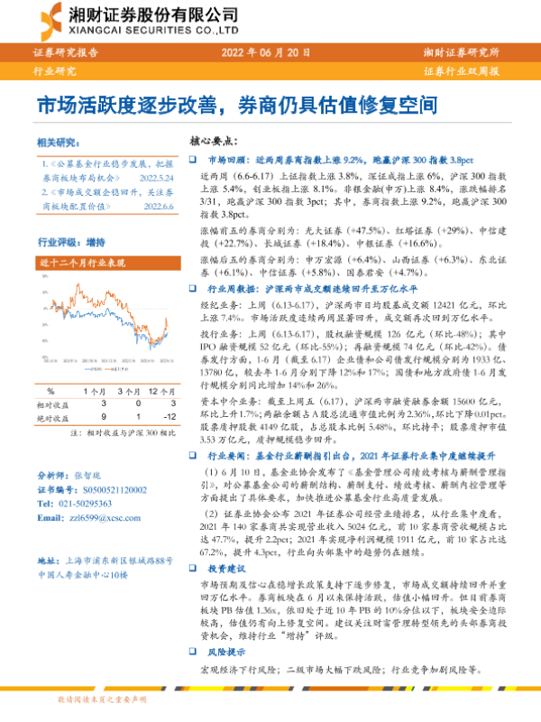 【湘财证券】【20220620】证券行业双周报:市场活跃度逐步改善,券商仍具估值修复空间-11页
