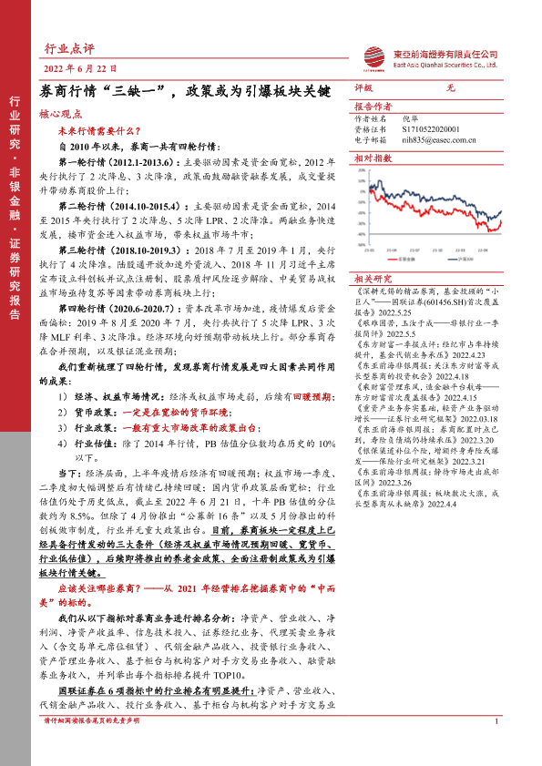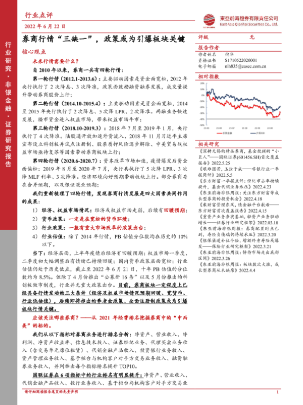【东亚前海证券】【20220622】非银金融行业点评:券商行情“三缺一”,政策或为引爆板块关键-5页