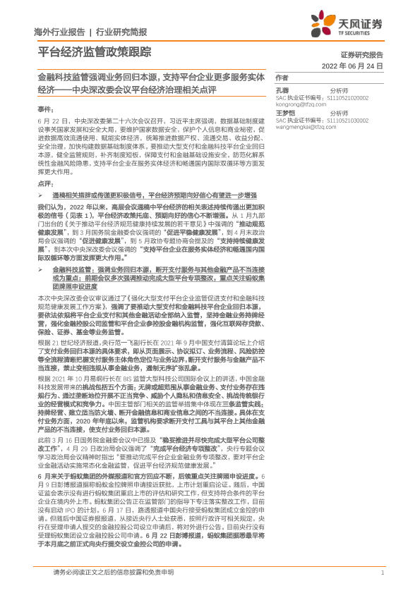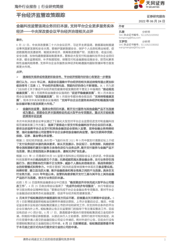 【天风证券】【20220624】中央深改委会议平台经济治理相关点评:金融科技监管强调业务回归本源,支持平台企业更多服务实体经济-4页