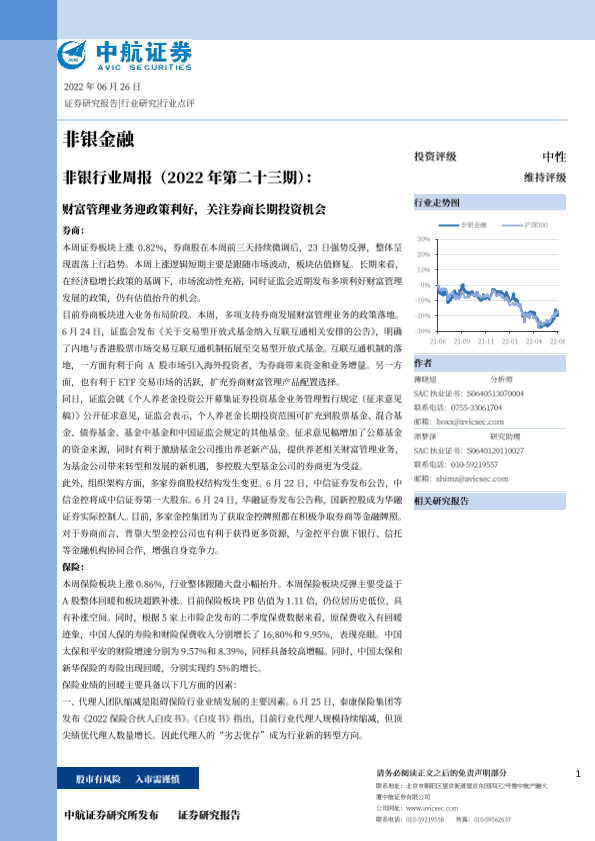 【中航证券】【20220626】非银行业周报:财富管理业务迎政策利好,关注券商长期投资机会-13页