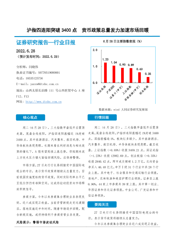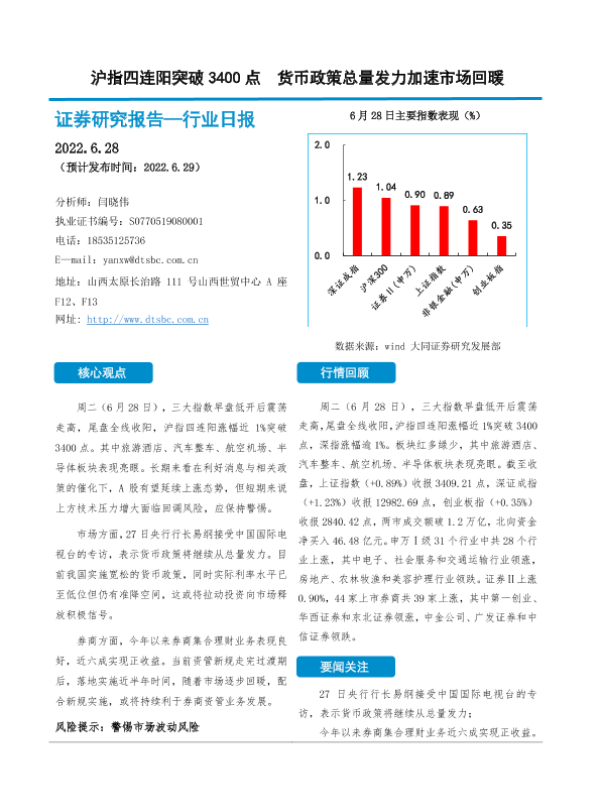 【大同证券】【20220628】非银金融行业日报:沪指四连阳突破3400点 货币政策总量发力加速市场回暖-10页