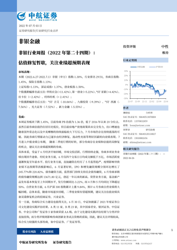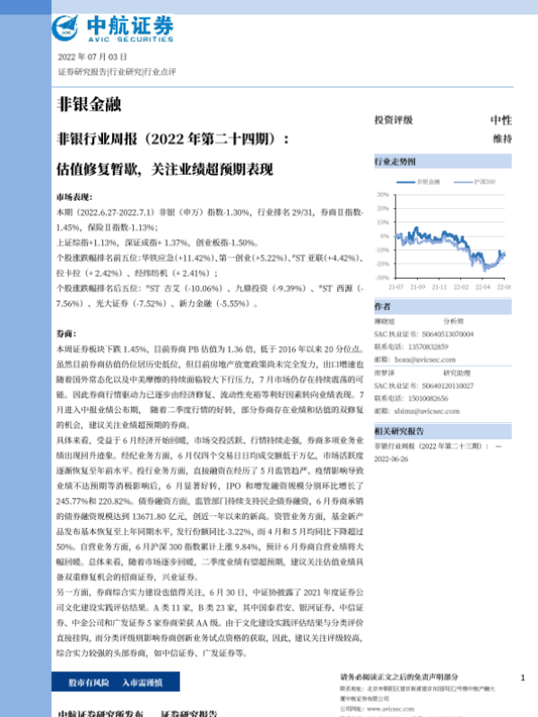 【中航证券】【20220703】非银行业周报:估值修复暂歇,关注业绩超预期表现-13页