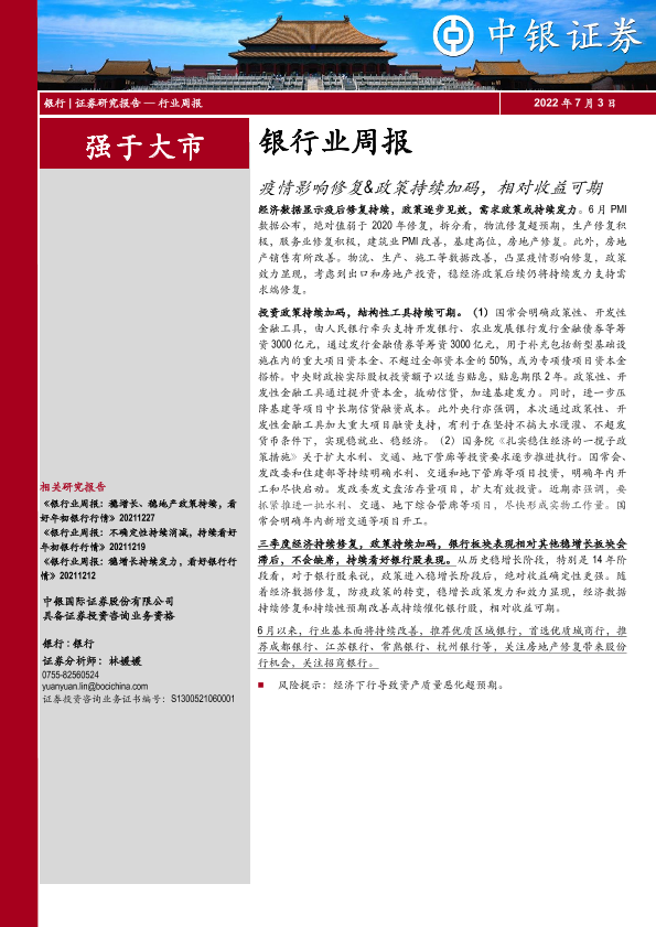 【中银证券】【20220703】银行业周报:疫情影响修复&政策持续加码,相对收益可期-24页