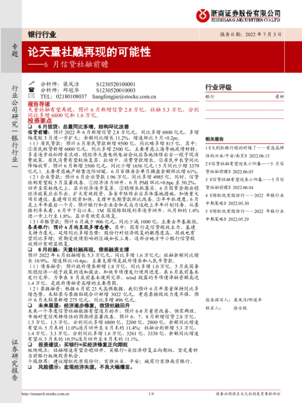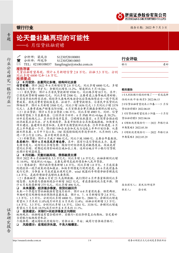 【浙商证券】【20220703】6月信贷社融前瞻:论天量社融再现的可能性-4页