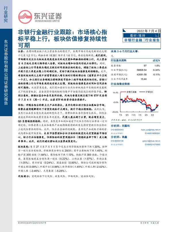 【东兴证券】【20220704】非银行金融行业跟踪:市场核心指标平稳上行,板块估值修复持续性可期-13页