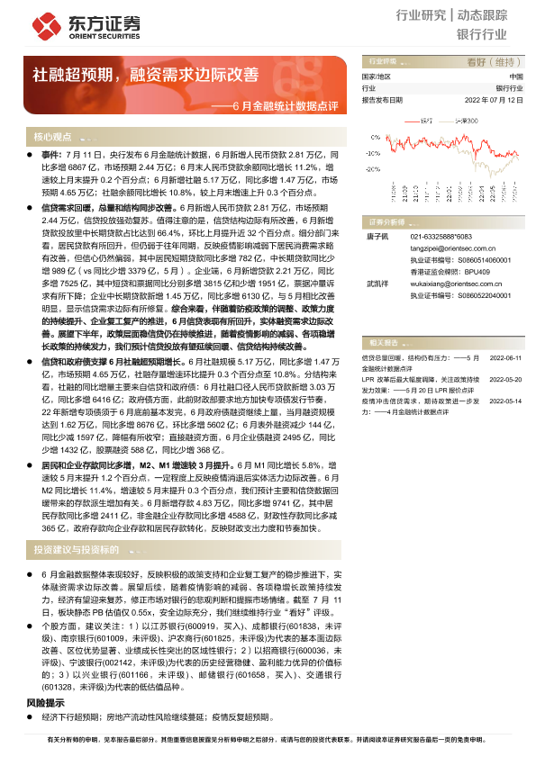 【东方证券】【20220712】6月金融统计数据点评:社融超预期,融资需求边际改善-4页