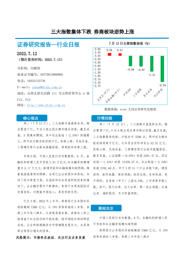 【大同证券】【20220712】非银金融行业日报:三大指数集体下跌 券商板块逆势上涨-10页