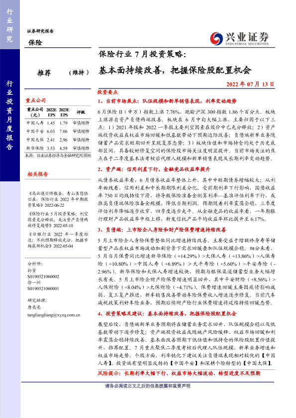 【兴业证券】【20220713】7月保险行业投资策略:基本面持续改善,把握保险股配置机会-18页