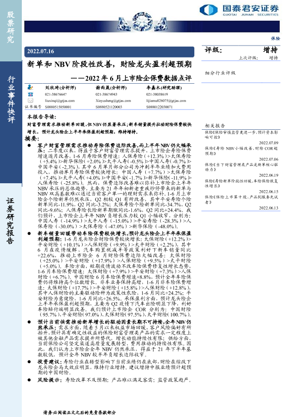 【国泰君安证券】【20220716】新单和NBV阶段性改善,财险龙头盈利超预期——2022年6月上市险企保费数据点评-5页