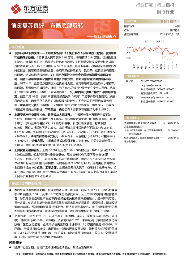 【东方证券】【20220717】银行业周观点:信贷复苏良好,布局底部反转-16页