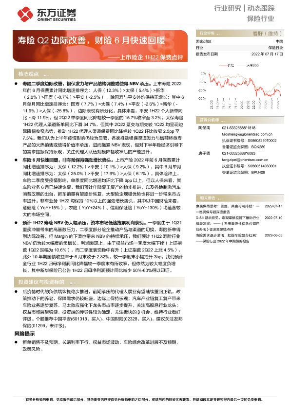 【东方证券】【20220717】上市险企1H22保费点评:寿险Q2边际改善,财险6月快速回暖-5页