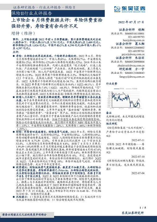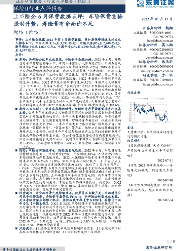 【东吴证券】【20220717】上市险企6月保费数据点评:车险保费重拾强劲升势,寿险量有余而价不足-5页
