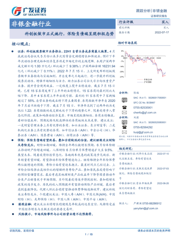 【广发证券】【20220717】非银金融行业跟踪分析:科创板做市正式施行,保险负债端呈现积极态势-13页
