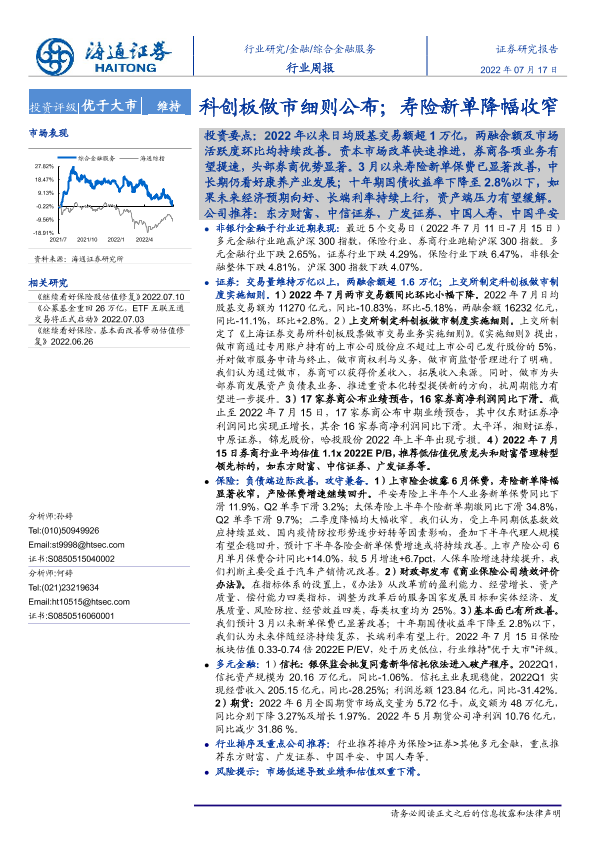 【海通证券】【20220717】综合金融服务行业周报:科创板做市细则公布;寿险新单降幅收窄-12页