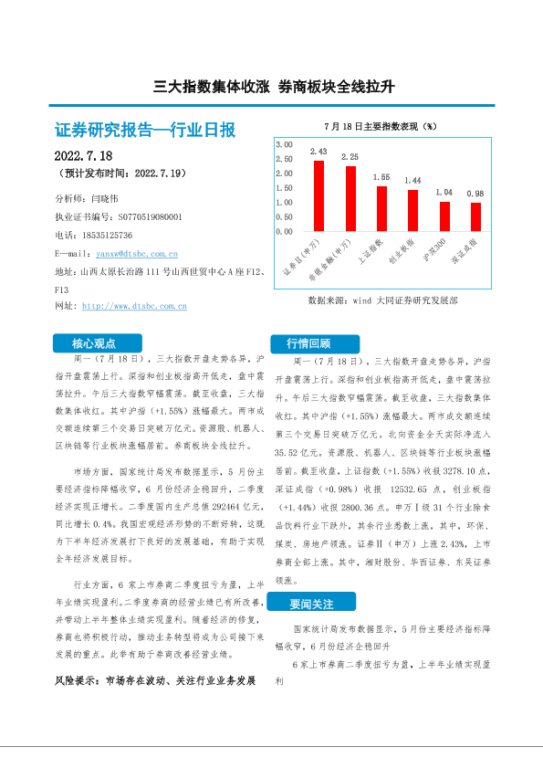 【大同证券】【20220718】三大指数集体收涨 券商板块全线拉升-10页