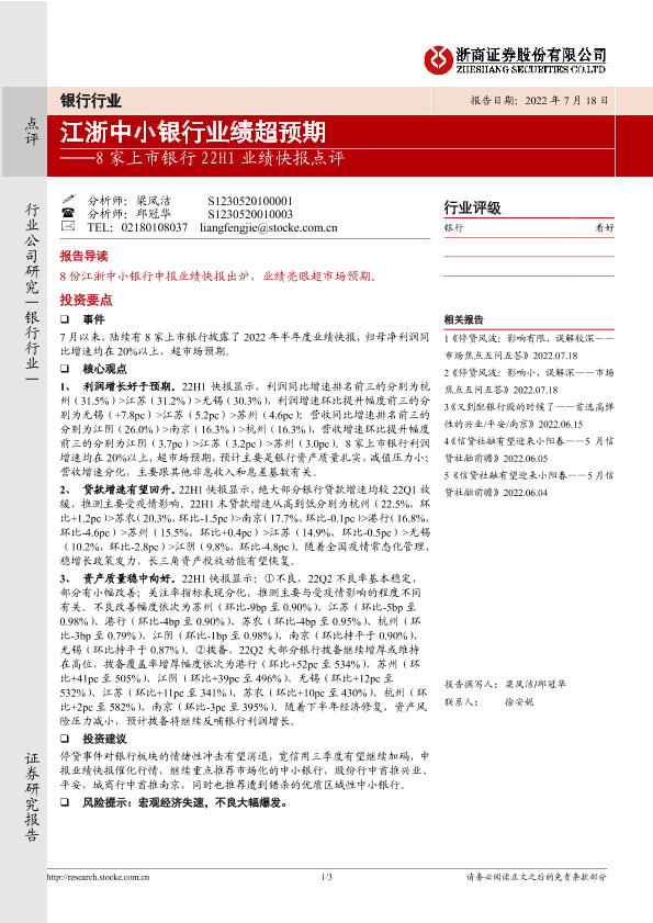 【浙商证券】【20220718】8家上市银行22H1业绩快报点评:江浙中小银行业绩超预期-3页