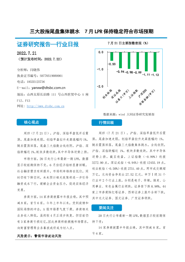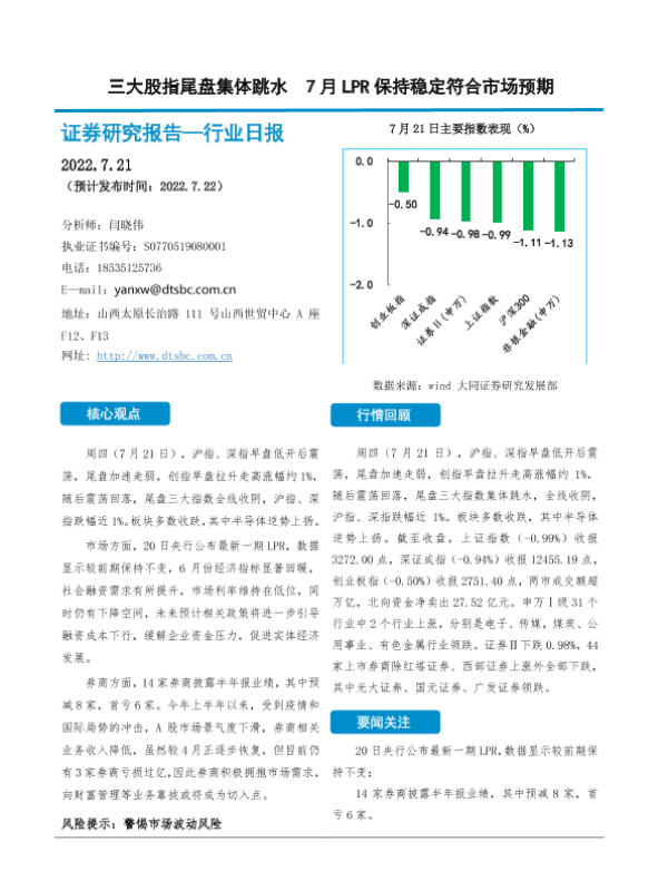 【大同证券】【20220721】非银金融行业日报:三大股指尾盘集体跳水 7月LPR保持稳定符合市场预期-10页
