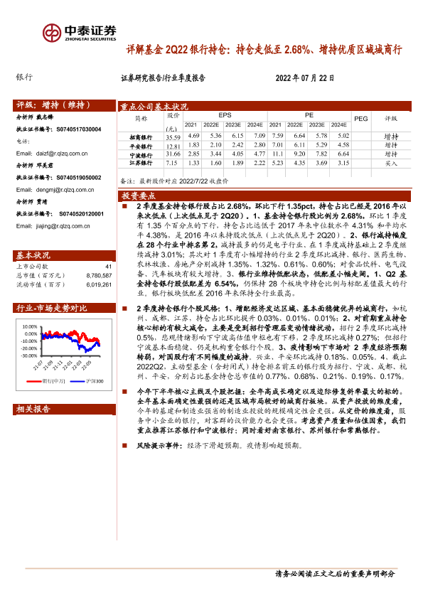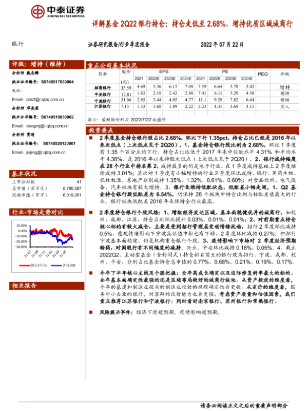【中泰证券】【20220722】详解基金2Q22银行持仓:持仓走低至2.68%、增持优质区域城商行-11页