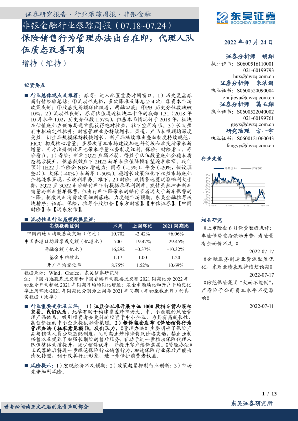【东吴证券】【20220724】非银金融行业跟踪周报:保险销售行为管理办法出台在即,代理人队伍质态改善可期-13页
