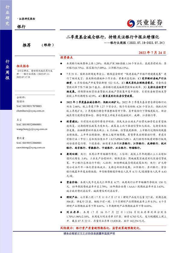 【兴业证券】【20220724】二季度基金减仓银行,持续关注银行中报业绩催化-15页