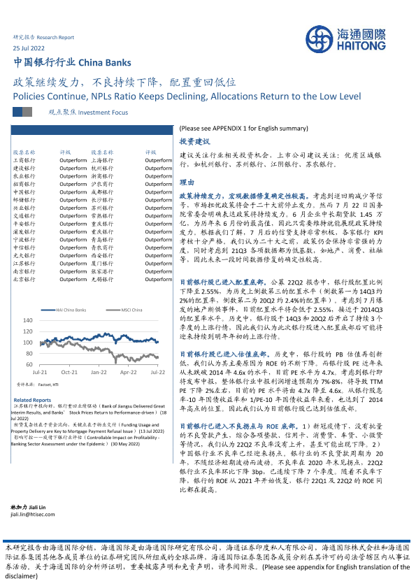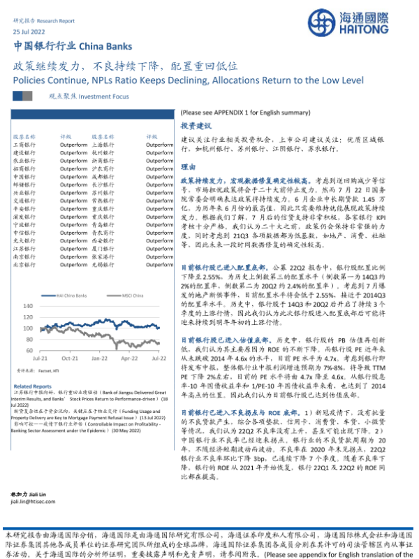 【海通国际】【20220725】中国银行行业:政策继续发力,不良持续下降,配置重回低位-11页