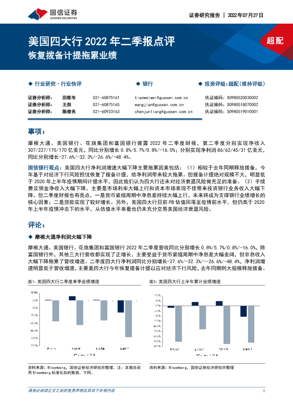 【国信证券】【20220727】美国四大行2022年二季报点评:恢复拨备计提拖累业绩-11页