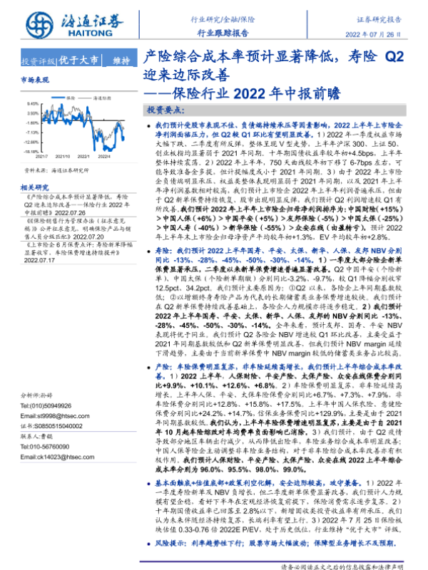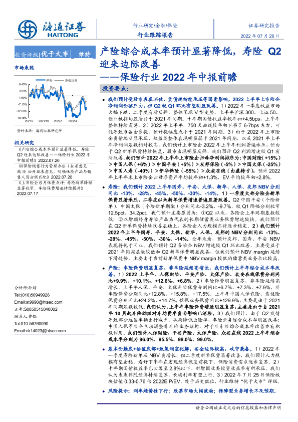 【海通证券】【20220726】保险行业2022年中报前瞻:产险综合成本率预计显著降低,寿险Q2迎来边际改善-6页
