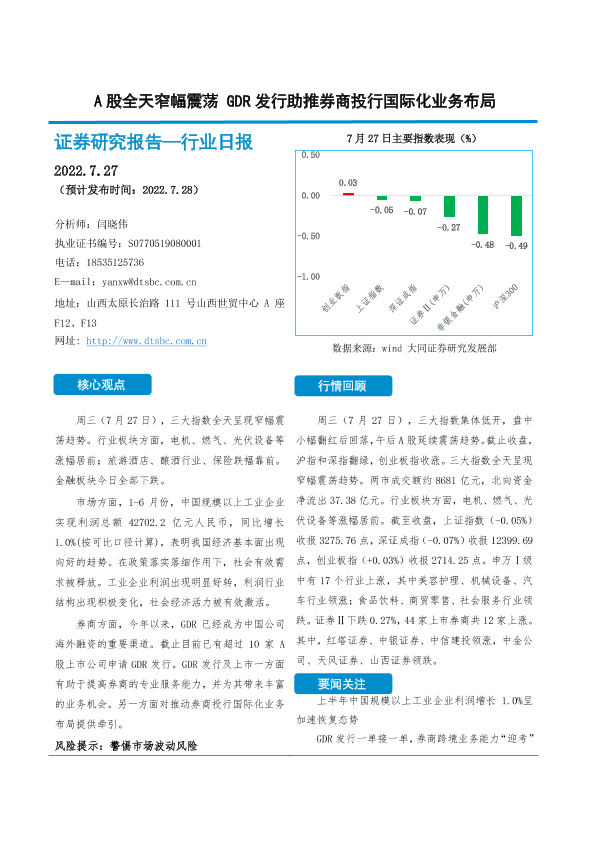 【大同证券】【20220727】A股全天窄幅震荡 GDR发行助推券商投行国际化业务布局-10页