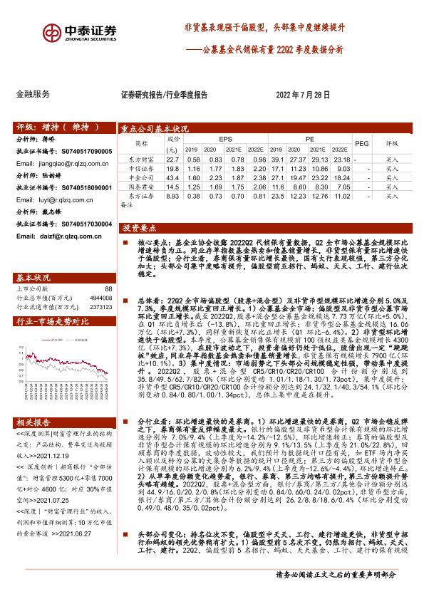 【中泰证券】【20220728】公募基金代销保有量22Q2季度数据分析:非货基表现强于偏股型,头部集中度继续提升-13页