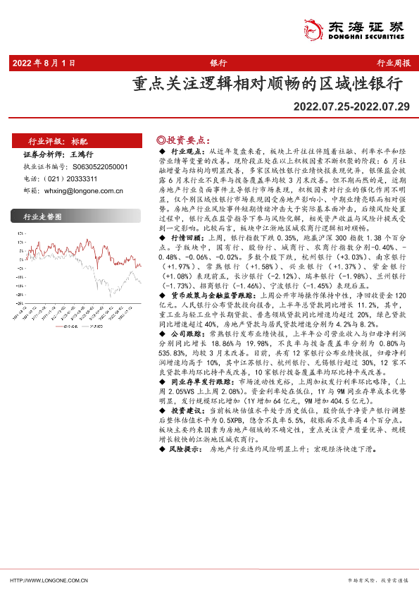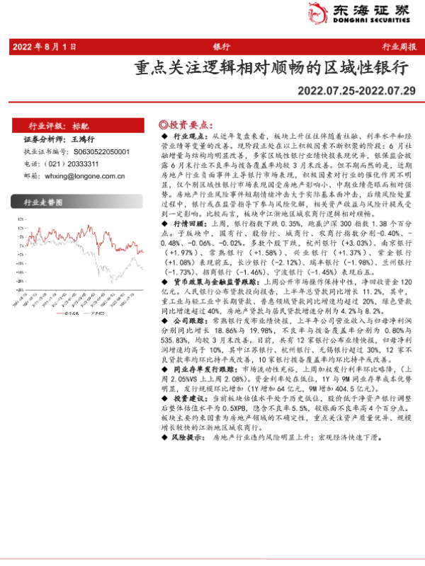 【东海证券】【20220801】银行业周报:重点关注逻辑相对顺畅的区域性银行-11页