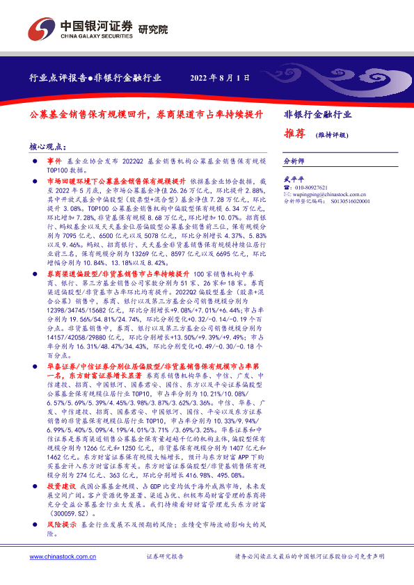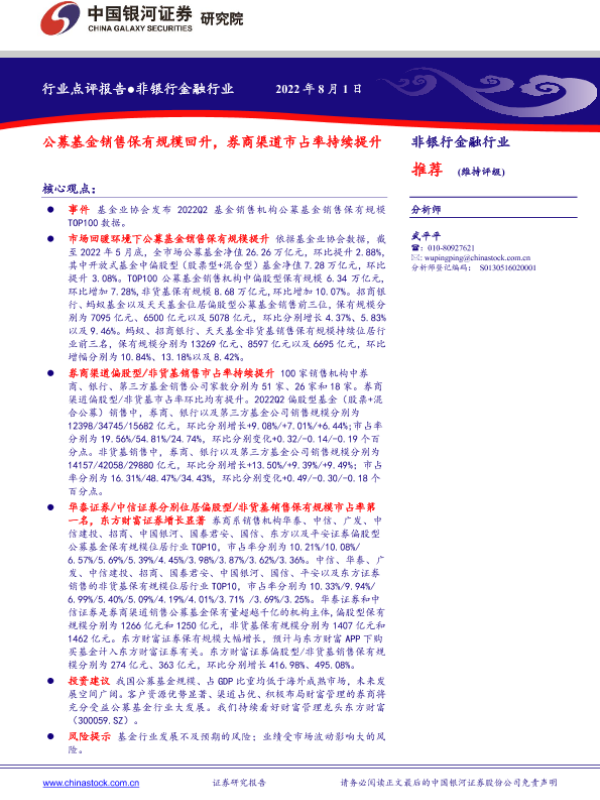 【银河证券】【20220801】非银行金融行业:公募基金销售保有规模回升,券商渠道市占率持续提升-2页