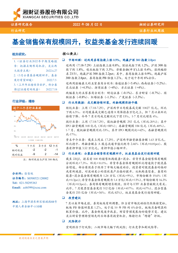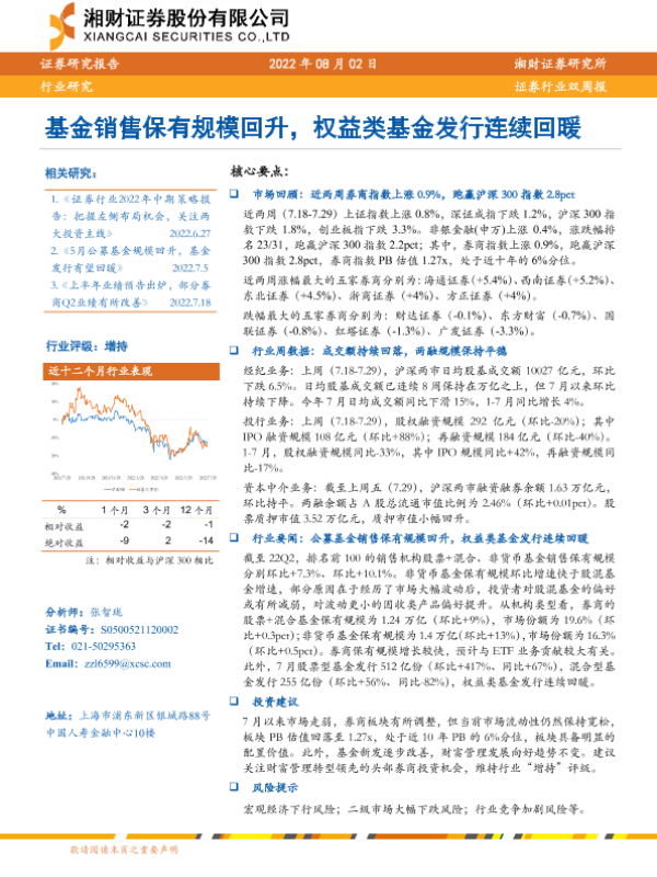 【湘财证券】【20220802】证券行业双周报:基金销售保有规模回升,权益类基金发行连续回暖-10页