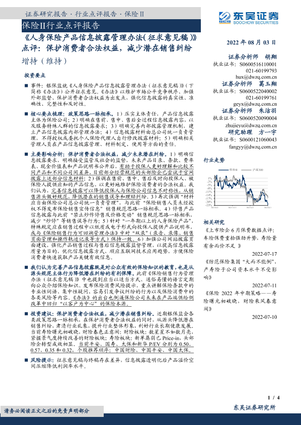 【东吴证券】【20220803】人身保险产品信息披露管理办法(征求意见稿)点评:保护消费者合法权益,减少潜在销售纠纷-4页