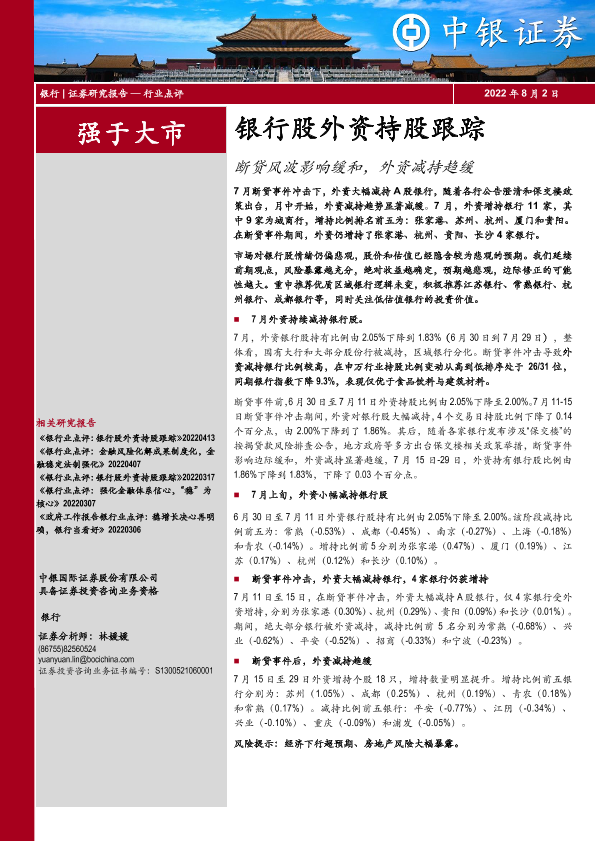 【中银证券】【20220802】银行股外资持股跟踪:断贷风波影响缓和,外资减持趋缓-15页