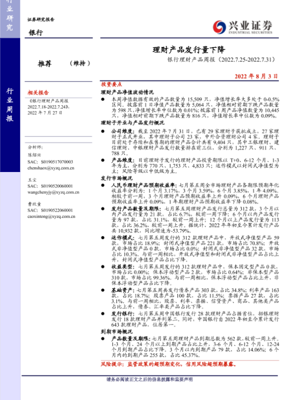 【兴业证券】【20220803】银行理财产品周报:理财产品发行量下降-19页