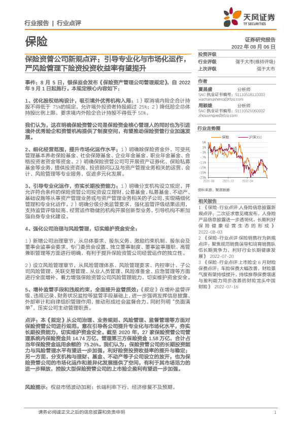 【天风证券】【20220806】保险资管公司新规点评:引导专业化与市场化运作,严风险管理下险资投资收益率有望提升-2页