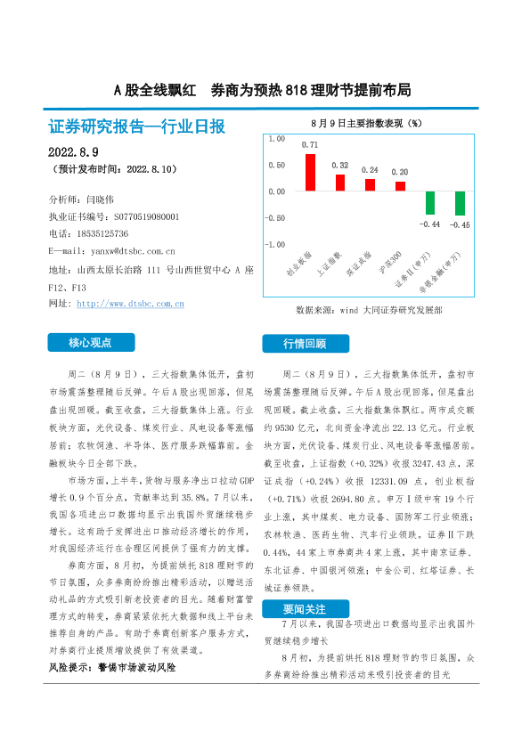 【大同证券】【20220809】A股全线飘红 券商为预热818理财节提前布局-10页