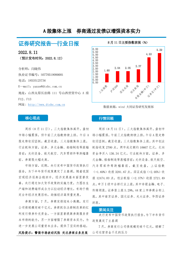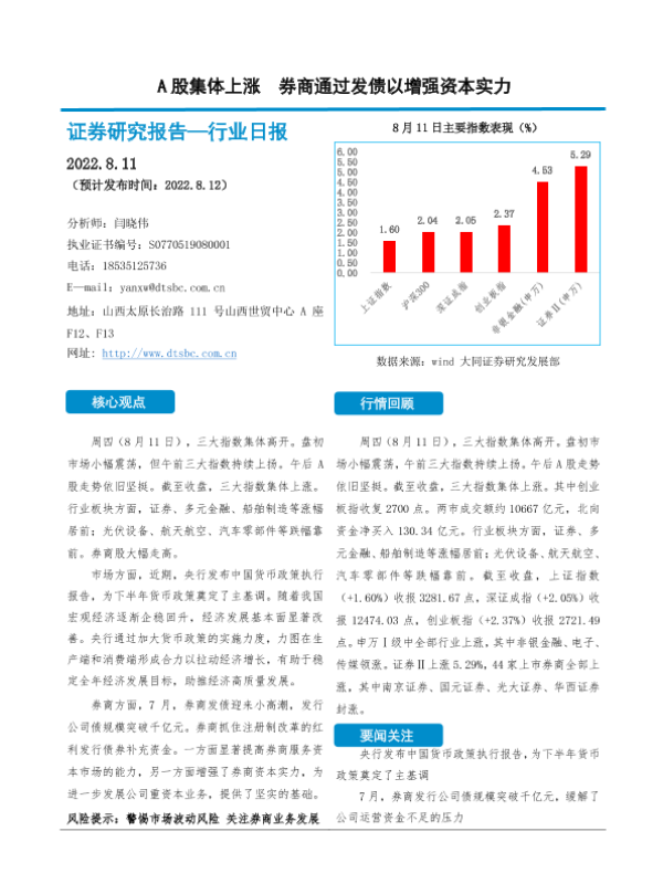【大同证券】【20220811】非银金融行业日报:A股集体上涨 券商通过发债以增强资本实力-10页