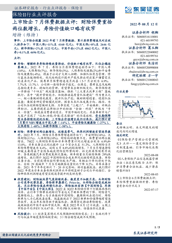 【东吴证券】【20220812】上市险企7月保费数据点评:财险保费重拾两位数增长,寿险价值缺口略有收窄-5页