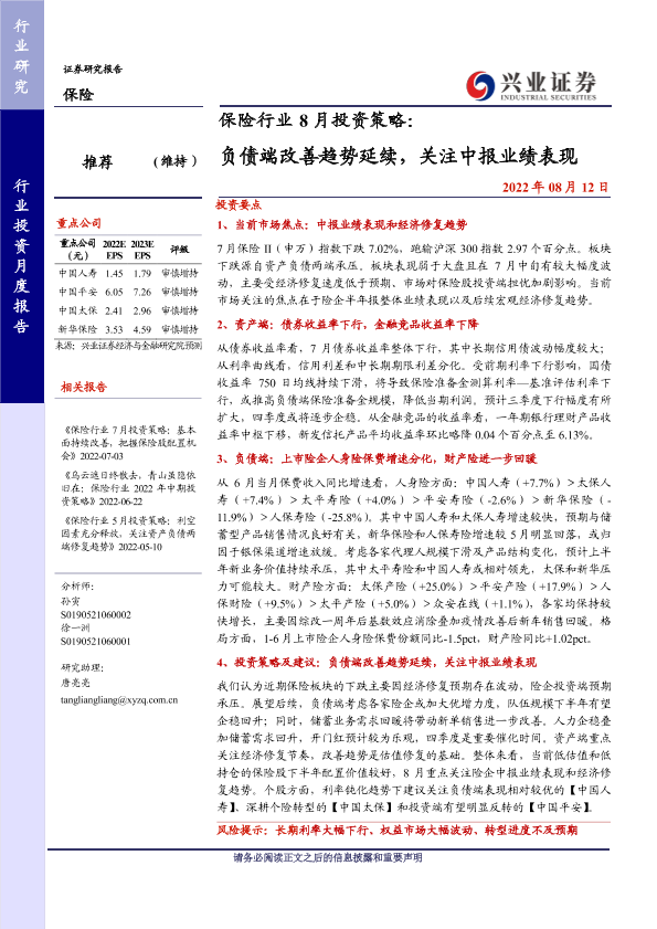 【兴业证券】【20220812】8月投资策略:负债端改善趋势延续,关注中报业绩表现-18页