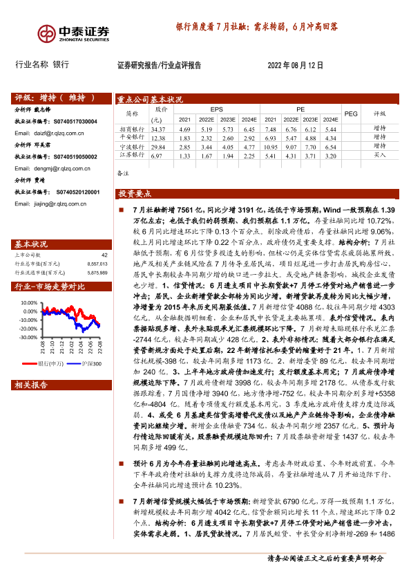 【中泰证券】【20220812】银行角度看7月社融:需求转弱,6月冲高回落-13页