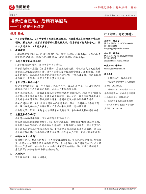 【浙商证券】【20220813】7月信贷社融点评:增量低点已现,后续有望回暖-5页