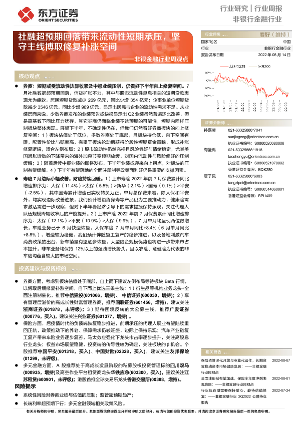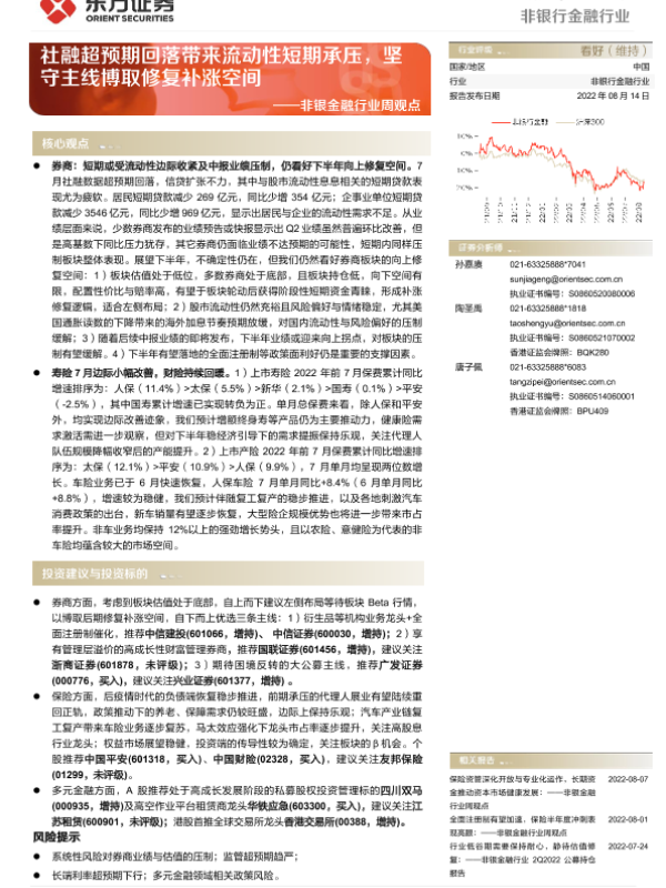 【东方证券】【20220814】非银金融行业周观点:社融超预期回落带来流动性短期承压,坚守主线博取修复补涨空间-13页