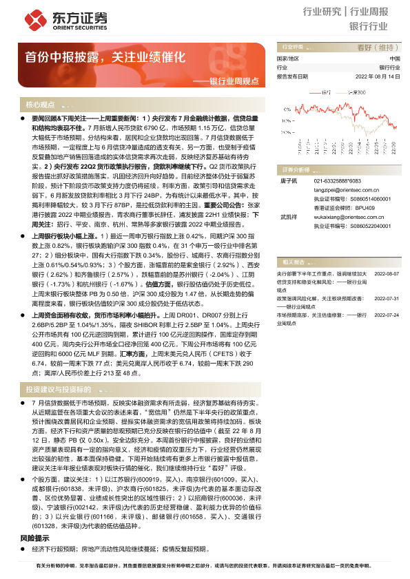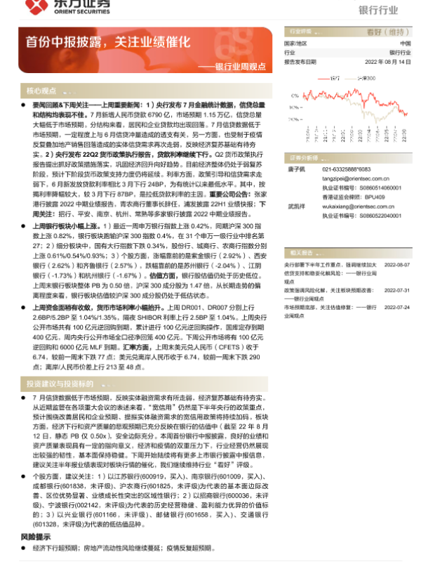 【东方证券】【20220814】银行业周观点:首份中报披露,关注业绩催化-14页