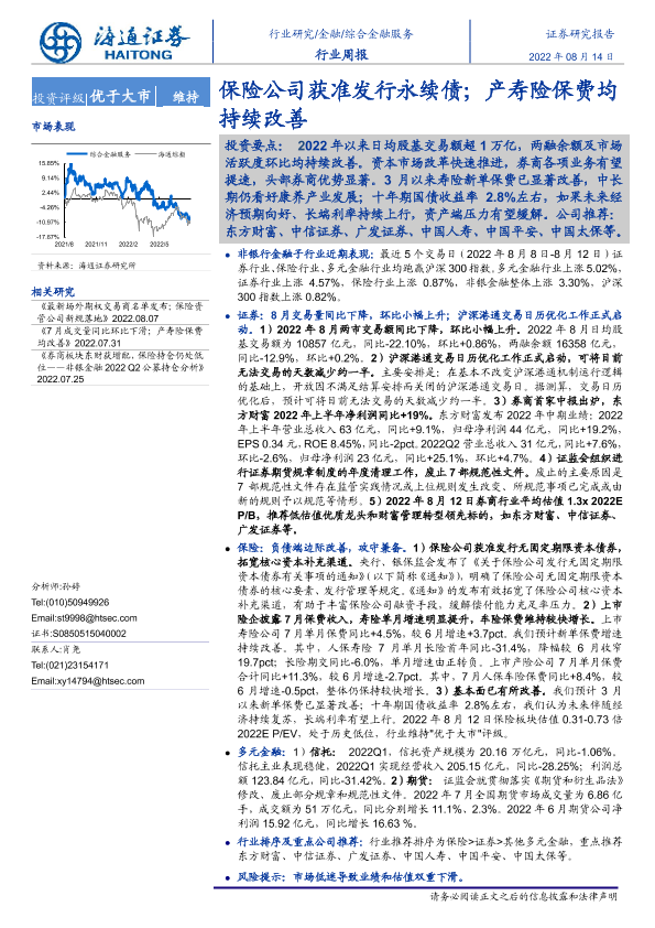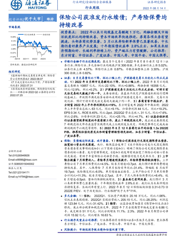 【海通证券】【20220814】非银金融行业周报:保险公司获准发行永续债;产寿险保费均持续改善-12页