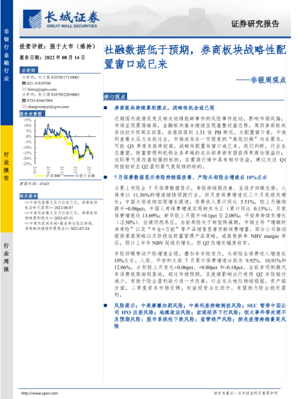 【长城证券】【20220814】非银周观点:社融数据低于预期,券商板块战略性配置窗口或已来-34页