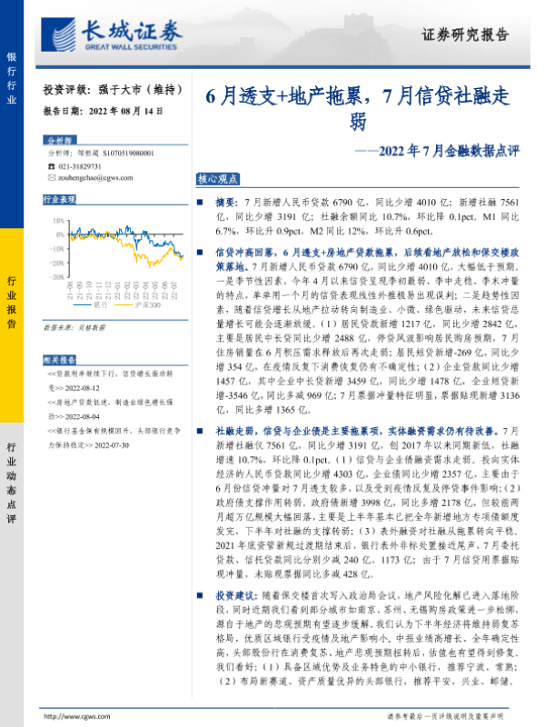 【长城证券】【20220814】2022年7月金融数据点评:6月透支+地产拖累,7月信贷社融走弱-5页