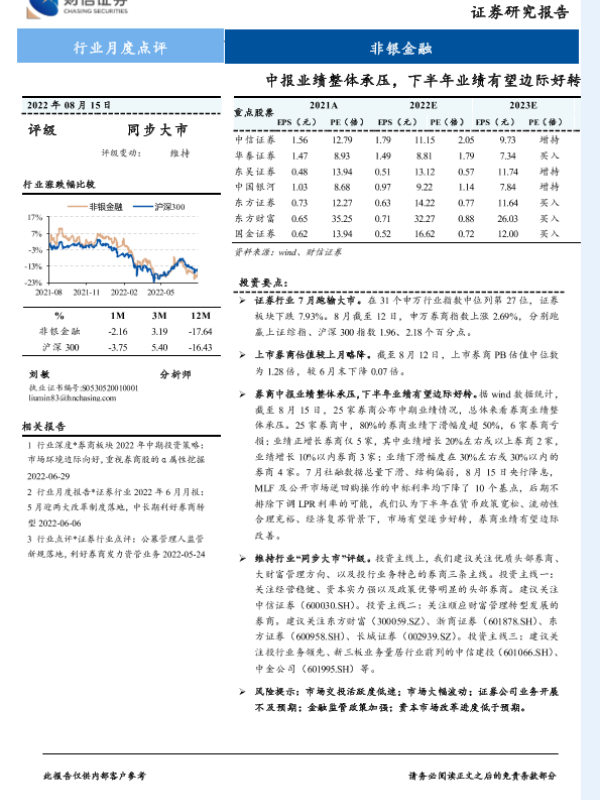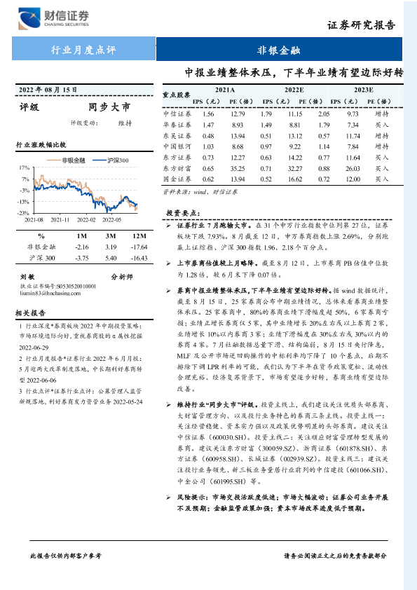 【财信证券】【20220815】非银金融行业月度点评:中报业绩整体承压,下半年业绩有望边际好转-9页