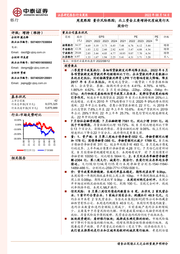 【中泰证券】【20220814】银行周度跟踪:量价风险跟踪;北上资金主要增持优质城商行及股份行-20页
